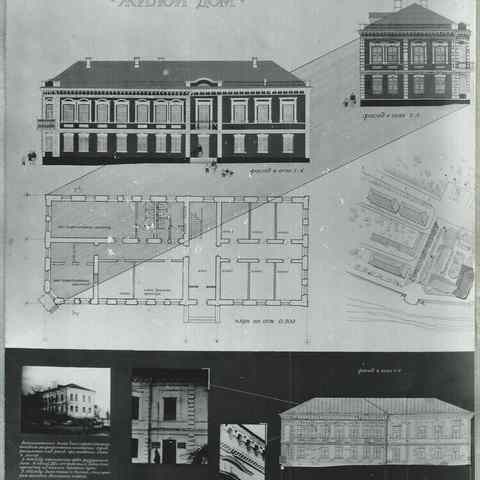 Прямоугольный в плане двухэтажный дом, накрытый 4-хскатной вальмовой крышей. Главный фасад разделен по вертикали сложным карнизом с орнаментом и сухариками, по горизонтали проходит ритм рустованных лопаток. Поверхность стены первого этажа прорезана лучковыми оконными проемами, которые украшены замковым камнем. Окна второго этажа декорированы наличниками, сандриками и орнаментом. Система планировки коридорная.
